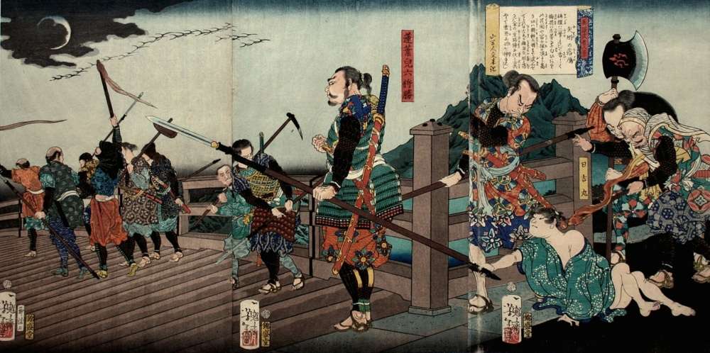 Image: Tsukioka Yoshitoshi, “Biographies of Great Warriors: Wild Geese over Yahagi,” depicting Hachisuka Koroku public domain